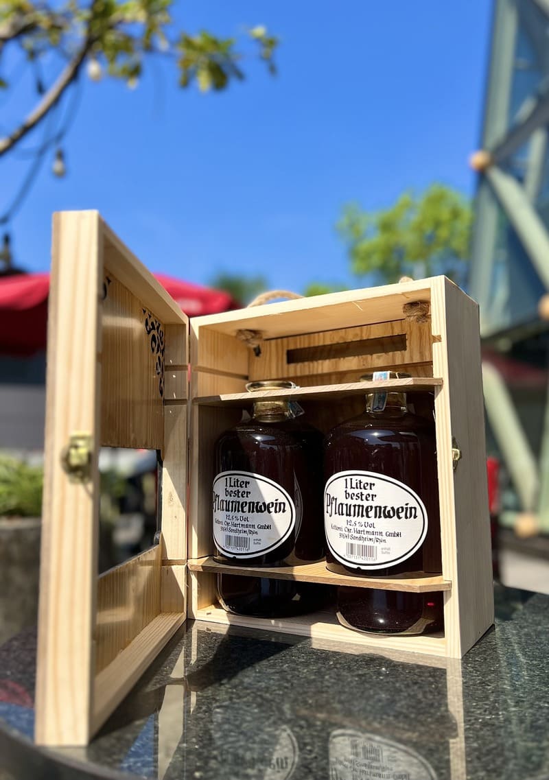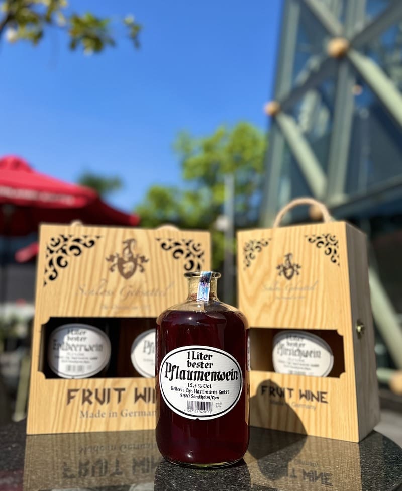 Rượu vang Pflaumenwein (Vang mận) thường có màu đỏ đậm, hương vị đặc trưng, tạo nên sự độc đáo và hấp dẫn cho thực khách.